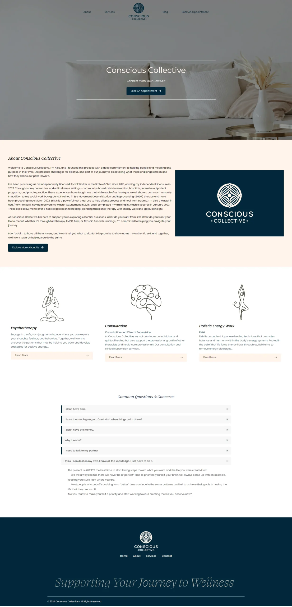 Conscious Collective Therapy needed a website that would shatter the mold of traditional, “stuffy” therapy sites to connect with a modern audience of creatives and professionals. We crafted a bold, minimalist therapist website design that mirrors their authentic, direct approach, creating a sophisticated digital space that feels as real and relatable as the therapy they provide.